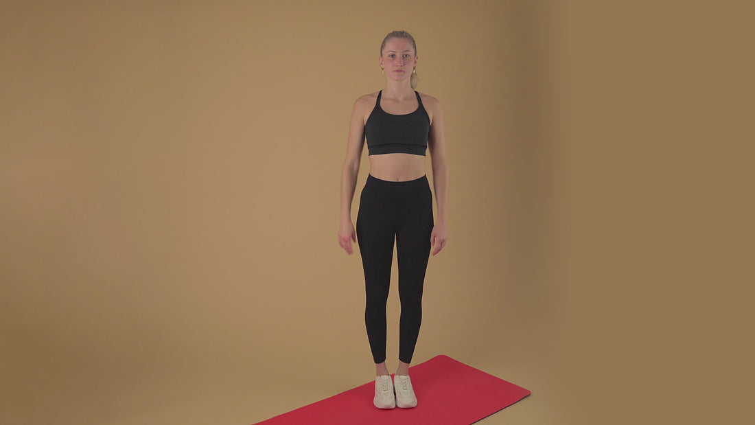 In Schrittstellung, mit dem Rücken zur Tür stehen und das vordere Knie beugen.